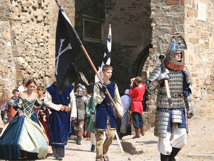 Нас ждет красочное зрелище: массовые рыцарские сражения, турниры, стрельба из арбалетов, пушек, кулеврин и требушетов, выступления танцоров и песни трубадуров.