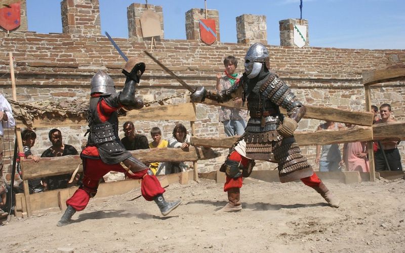 Турниры рыцарей на фестивале «Генуэзский шлем» проходят по правилам проведения поединков по историческому фехтованию.
